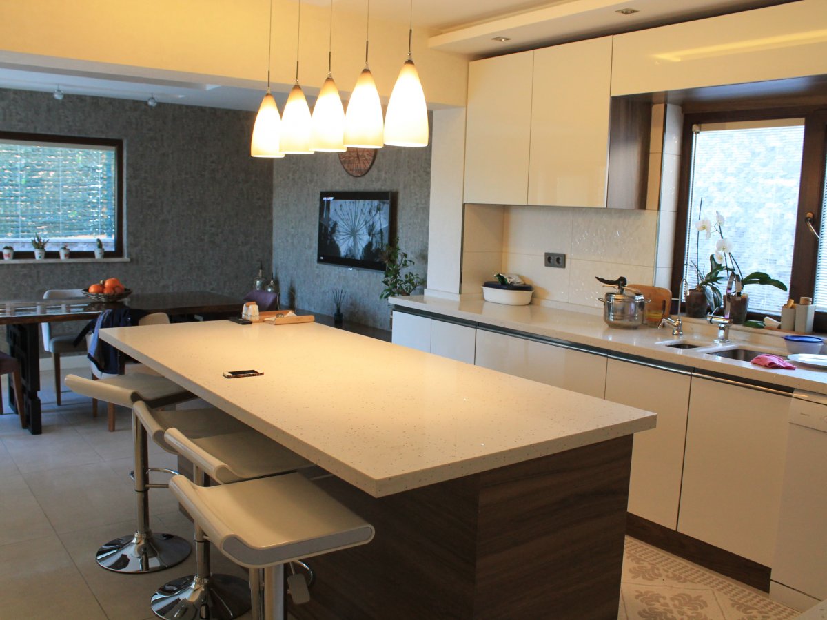 Çimstone tezgah, doğal ceviz kaplama ve beyaz akriliğin uyumu...